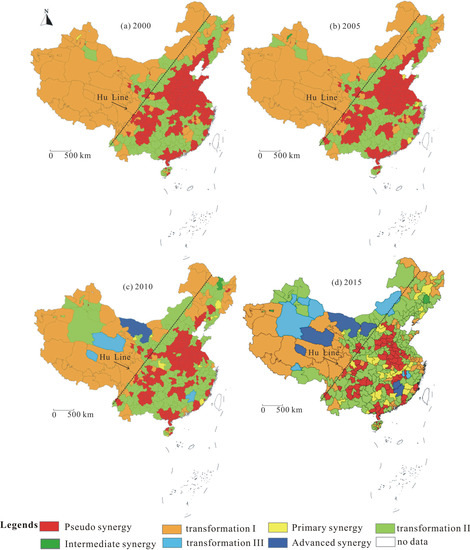 Figure 2c,d) shows the situation in the second half of the investigation period; compared with the previous two typical periods, the state of the GEP–GDP synergy in the Chinese mainland gradually improved in 2010, and as municipal units in the pseudo-synergy stage and transition phase I gradually shrank, municipal units in the transition phase II stage showed an intensive expansion trend compared with the previous ones. It should also be noted that some municipal units in this period developed into transformation phase III or even the advanced GEP–GDP synergy stage. Finally, Figure 2d shows that the GEP–GDP synergy in mainland China continued to improve in 2015, and the municipal units on the southeastern Chinese mainland of the Hu Line that were originally in the pseudo-synergy stage gradually progressed to the primary synergy stage or transition phase II and even transformed to the advanced GEP–GDP synergy stage. Simultaneously, as more municipal units transitioned to transition phase II, transition phase III, or even the advanced GEP–GDP synergy status, the number of municipal units in the area to the northwest Chinese mainland of the Hu Line, which were originally in transition phase I, was remarkable reduced compared to the previous stage.