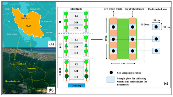 Location of the study area in northern Iran (a); Kheyrud forests (Namkhaneh and Gorazbon districts) within the Hyrcanian forests (b); schematic representation of the experimental design on the skid trail and undisturbed area (c). Different tree litter treatments: B: beech, B-H: beech–hornbeam, B-H-O: mixed beech or beech–hornbeam–other species. Different traffic intensities: HT: high traffic intensity, MT: medium traffic intensity, and LT: low traffic intensity.