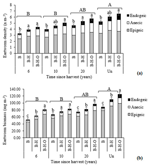 Mean values of earthworm density (epigeic, anecic, and endogeic) (a) and biomass (b) in different years since harvest and in undisturbed area, under three litter treatments. The litter treatments studied were beech (B), beech–hornbeam (B-H), and mixed beech (B-H-O). Harvesting period: 6, 10, and 20 years since harvest. For earthworm density, time since harvest (F = 69.441; p < 0.001), litter treatment (F = 52.393; p < 0.001), and their interaction (F = 3.216; p = 0.035). For earthworm biomass, time since harvest (F = 20.742; p < 0.001), litter treatment (F = 47.574; p < 0.001), and their interaction (F = 10.560; p < 0.001). Different capital and lowercase letters indicate significant differences (p < 0.05 by Duncan test) between the harvesting period (year since harvest) and the litter treatments, respectively.