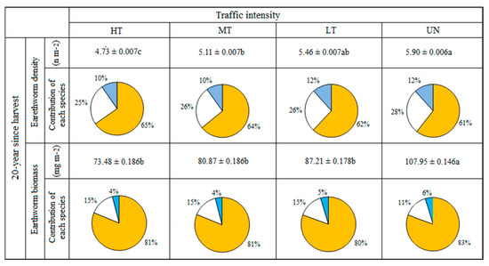 Mean values (±SD) of the earthworm density and biomass 20 years after harvesting under different traffic intensities (HT: skid trail with high traffic intensity, MT: skid trail with medium traffic intensity, LT: skid trail with low traffic intensity, and UN: undisturbed area). Contribution of epigeic (orange color), anecic (white color), and endogeic (blue color) earthworm density and biomass under different traffic intensities. Different letters in a row indicate significant differences among the total nematodes of the soil (p < 0.05), based on Duncan’s multiple range tests.