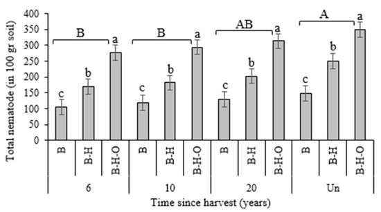 Mean values of total nematodes in different years since harvest under three litter treatments. The studied litter treatments were beech (B), beech–hornbeam (B-H), and mixed beech (B-H-O). Harvesting period: 6, 10, and 20 years after harvest. For total nematodes, time since harvest (F = 473.015; p < 0.001), traffic intensity (F = 220.172; p < 0.001), and their interaction (F = 29.145; p = 0.021). Different capital and lowercase letters indicate significant differences (p < 0.05 by Duncan test) between harvesting period (year after harvest) and litter treatments, respectively.
