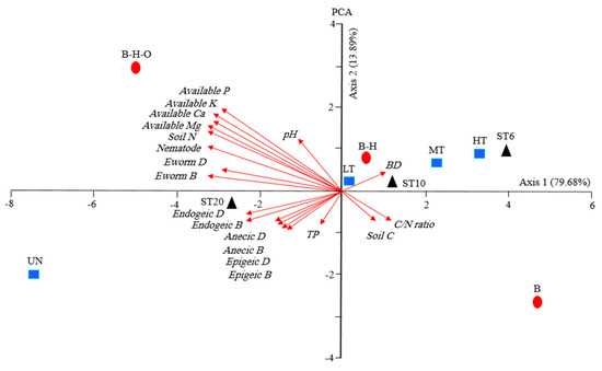From PCA analysis, the first and second axes explained 79.68% and 13.89% of the variance in relation with litter type, years after harvest, traffic intensity, and soil properties (Figure 5). The left side of the graph showed alkaline soil, high porosity, accumulation of macro-element nutrients (available P, K, Ca, Mg), and more biological activities (earthworm and nematode population), and this can be attributed to the litter type B-H-O and the 20-year period after harvesting (ST20 treatment), while the right side of the graph showed the positions of high BD, acidic soil, lower levels of macro-element nutrients, and low biological activities imposed by B, B-H, HT, MT, LT, ST6 (6-year period), and ST10 treatments (10-year period) (Figure 5).