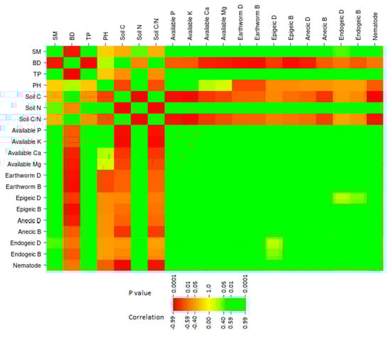 Pearson correlation analysis showed that there were significant correlations between most physicochemical and biological properties (earthworm and nematode activity) (Figure 6). N content, available nutrients (available P, K, Ca, Mg), soil moisture content, and porosity as key variables had positive correlations with the activities of earthworms (epigeic, anecic, and endogeic) and nematodes. In contrast, pH, bulk density, C content, and C/N ratio had significant negative correlations with soil biological properties (Figure 6).