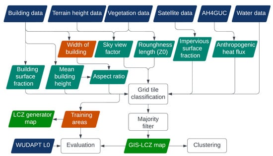 In this study, a GIS-based method was employed to derive the LCZs for Berlin. The general GIS-LCZ mapping process is illustrated in Figure 1. The process was initialized by collecting vector and raster data that are later used to calculate the zone properties. The zone properties are calculated based on a basic spatial unit (BSU), which is defined as a grid tile. Each BSU is classified applying a fuzzy logic algorithm to derive the LCZs. During post-processing, a filtering is carried out to the classification result of LCZs. An evaluation was performed on the final GIS-LCZ by comparing it to the new training areas. The new training areas were further used to evaluate the existing WUDAPT L0 map and to generate an LCZ map from the LCZ generator. Furthermore, the zone properties of the grid tiles were clustered, and then compared to the GIS-LCZ result.