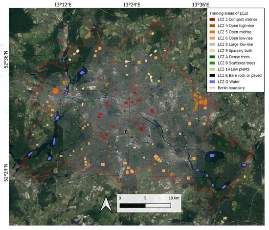 The focus of this study is the city of Berlin. Berlin has an area of 892 . As of 2019, its population was around 3.8 million, which makes it the most populous city in Germany. One of the reasons for choosing this city is the availability of the GIS data, which we require for deriving the GIS-LCZ map. A Google Earth image of Berlin and the newly created training areas (see Section 2.5) shown in Figure 2.