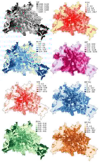 The sky view factor (SVF) is calculated by applying raster height data of building, terrain, and vegetation patch derived from the DLR dataset with a resolution of 5 . The calculation is performed by employing the Urban Multi-scale Environmental Predictor (UMEP) plugin in QGIS by Lindberg et al. [32]. The DLR rasters of building and vegetation patch height with a resolution of 1 are also used for the calculation of mean building height (H) for urban classes and mean vegetation height () for natural classes, respectively. The building surface fraction (BSF) is calculated to define the percentage of building area in a grid tile. Because not all building areas in Berlin are covered by the DLR data, additional building polygon data from OSM are used to define the BSF.