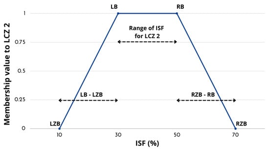 To understand how this membership function works, an example from Figure 4 is explained here. The zone property of the ISF of LCZ 2 has a range value from 30–50, which implies 30 as the left bound (LB), 50 as the right bound (RB) and length . When a grid tile has an ISF value, which is in this range (30–50), the membership value will be 1. On the other hand, when a grid tile has an ISF which is not in this range, the membership value will depend on how far it is away from the LB or RB. The membership value will become 0 for ISF values of less than 100 and more than 70. These values will be called as left zero bound (LZB) and right zero bound (RZB), respectively. The value of the RZB and LZB are defined as and .