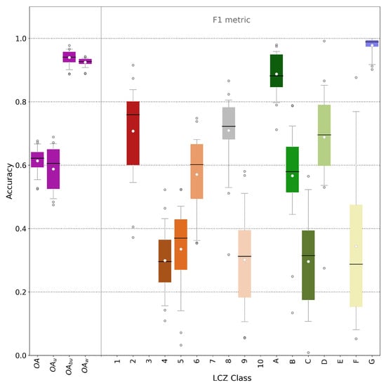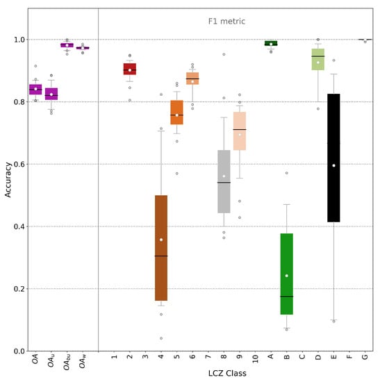 Boxplot accuracy of the LCZ generator map for the new training areas of Berlin; data from [39] (see also [15]).
