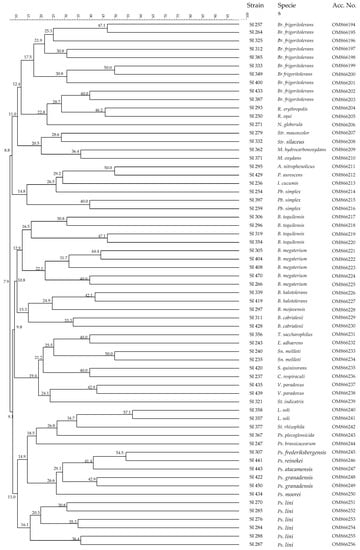 - Chun, J.; Lee, J.H.; Jung, Y.; Kim, M.; Kim, S.; Kim, B.K.; Lim, Y.W. EzTaxon: A web-based tool for the identification of prokaryotes based on 16S ribosomal RNA gene sequences. Int. J. Syst. Evol. Microbiol. 2007, 57, 2259–2261. [Google Scholar] [CrossRef]