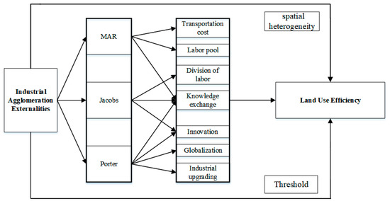 It should be pointed out that the agglomeration externalities will be uneven in time and space, as the industrial structure will be obviously spatially heterogeneous due to historical and natural conditions. Uneven inter-provincial development exists even in the urban agglomeration of the Yangtze River Delta, which promotes regional integration. Anhui Province, which still has a large proportion of primary industries, is not considered to be well integrated into the integration process of the Yangtze River Delta. In contrast, superior location conditions and more favorable industrial policies can attract various industries to take root in Jiangsu, Zhejiang and Shanghai, and therefore, these regions can have a more diversified industrial structure. In addition, there is always an optimal level of factor agglomeration due to both congestion and agglomeration effects in cities [70]. Excessive agglomeration may have a negative impact on land use efficiency [71]. The theoretical framework of the impact of industrial agglomeration externalities on ULUE is shown in Figure 1.
