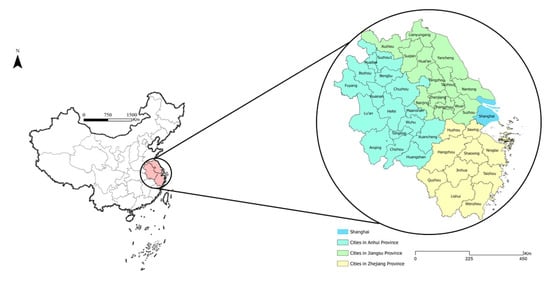 Located between 29°20′–32°34′ north latitude and 115°46′–123°25′ east longitude, the Yangtze River Delta region is a flood plain formed before the Yangtze River enters the sea, bearing 41 cities in Shanghai, Jiangsu, Zhejiang and Anhui provinces (see Figure 2). As these regions are adjacent to each other and have similar cultural backgrounds, they have become increasingly economically integrated through human and economic ties. Today, this region has become the largest and most comprehensive economic center in China, as well as one of the six city clusters in the world [72]. As the driving force of China’s economic growth, the industrial structure of the Yangtze River Delta is dominated by the second and third industries [73] and shows a high degree of spatial agglomeration [74].
