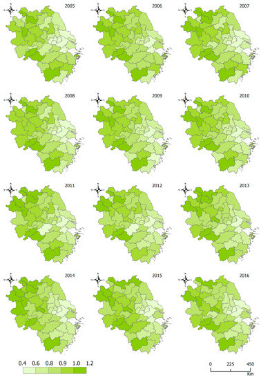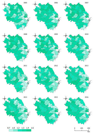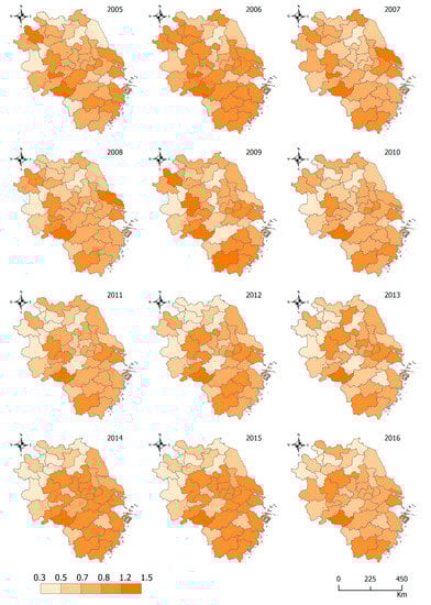 According to the calculation of the super-efficiency SBM model, the ULUE of 41 prefecture-level cities during 2005–2016 is shown in Figure 3. The annual average value of ULUE fluctuates around 0.88. Among them, Shanghai has the highest ULUE, with an annual average value of 1.11, followed by Zhejiang province, with an annual average value of 0.96. Jiangsu province and Anhui province have a lower ULUE, with an annual average of 0.85 and 0.84, respectively. After more than a decade of development, the gap of ULUE between cities has narrowed, and cities in the Yangtze River Delta are increasingly tending to develop in a balanced way. Cities with a high rank in hierarchy always have high ULUE, for example, Shanghai, Hangzhou and so on. Due to spatial spillover effects, their surrounding cities’ ULUE also perform well. Some cities have got high ULUE, even if they do not have the location advantages. The reason is that these cities are well-known tourist cities in China. On the one hand, they can obtain considerable economic income by relying on tourism resources. On the other hand, for the sustainable development of tourism resources, the local governments of these cities have imposed strict restrictions on pollution emissions, so their ULUE performance is generally good. ULUE in the marginal cities of the study area is significantly lower than that in other cities. These cities are poorly located, far from the economic centers, and have a weak industrial base, resulting in poor performance of urban land use efficiency. From 2005 to 2016, the ULUE of prefecture-level cities showed obvious spatial correlation. In the early years, high ULUE values were scattered, and cities with high ULUE values existed in the northern, central and eastern parts of the study area. After 2014, ULUE showed an obvious trend of agglomeration toward the center and the south.