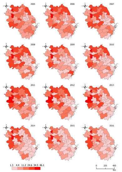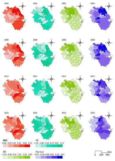 Figure 4 shows the temporal and spatial characteristics of MAR. Cities with high MAR values are mainly concentrated in the northern and western parts of the study area, while those in the middle and southern of the study area have low MAR values. The annual mean value of MAR in Anhui province was 7.37, which was much higher than that in other provinces and cities (2.35 in Zhejiang province, 2.80 in Shanghai and 3.00 in Jiangsu province). This is related to the level of development of prefecture-level cities in the region. Anhui province still faces difficulties in integrating into the regional integration of Yangtze River Delta. Its primary industry still accounts for a large proportion and absorbs a considerable part of the labor force [83]. Cities with low MAR values are mainly located in the central and southern part of the study area. Most of these cities are located on the eastern coast of China, which are the first to initiate market-oriented reforms and participate in global competition. Thanks to geographical conditions and policy support, these cities have attracted different kinds of enterprises to settle in, so their industrial specialization is not high. In addition, it can be seen that after more than a decade of development, MAR values of most cities in the Yangtze River Delta have decreased significantly, indicating that the overall industries of the urban agglomeration in the Yangtze River Delta tend to develop in a diversified way. By 2016, only several prefecture-level cities, such as Ma’anshan, Huainan and Huaibei, showed highly specialized industrial characteristics.