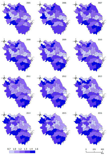 Figure 7 shows spatio-temporal characteristics of Porter. On the whole, the Porter externality shows obvious center-edge characteristics, and the Porter value in the center of the study area is significantly lower than that in the periphery. On a local scale, the Porter externality shows an obvious spatial agglomeration, forming the “Fuyang-Bozhou-Huaibei-Suzhou1” patch in the northwest, the “Cangzhou-Huangshan-Xuancheng” patch in the west, and the “Wenzhou-Jinhua-Taizhou” patch in the south of the study area. This can be explained by the current situation of the local industry. Wenzhou is the world-famous shoe manufacturing base, which gathers a large number of shoe factories, and the local shoe enterprises are increasingly competitive under the effect of the price mechanism. Yiwu, located in Jinhua, is responsible for the global distribution of small commodities. With the training of the global market and the support of local government, Yiwu’s small and medium-sized enterprises have upgraded rapidly and have strong competitiveness. Geographically, the intensity of industrial competition in each province is different. Over a 12-year time span, Shanghai’s industrial competition fluctuated the most stably, fluctuating in the range of 0.65 to 0.78, with an average of 0.70. The remaining three provinces experienced a rather severe and unstable industrial competition during the past decade. However, from an overall perspective, the intensity of the industrial competition in the Yangtze River Delta has eased, with the mean value of Porter dropping from 1.30 in 2005 to 1.28 in 2016, indicating that the industrial competition among prefecture-level cities is in a relatively balanced state and that the strategic promotion of the integration of urban agglomeration in the Yangtze River Delta has been effective.