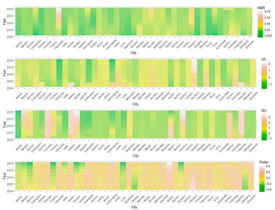 The regression coefficient of the Porter externality fluctuated between −0.47 and 0.41. The spatio-temporal heterogeneity of the Porter externality is particularly obvious. In general, positive Porter values are concentrated in the eastern part of the study area, while negative Porter values are concentrated in the western part of the study area and occupy most of the area. After 2012, the Porter coefficient showed an obvious spatial transfer. Jiangsu province, Zhejiang province and Shanghai gradually benefited from industrial competition, while industrial competition in Anhui province showed an obstacle to ULUE.
