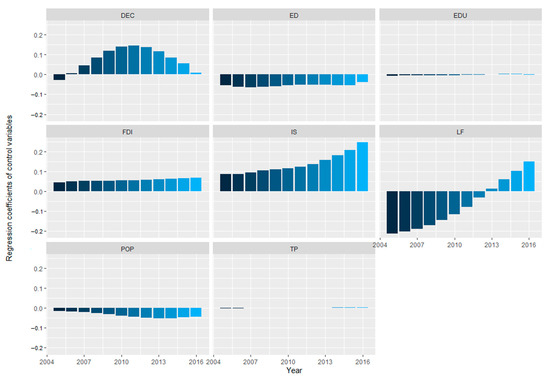 This study selected population density (POP), transport infrastructure (TP), human capital (EDU), economic development level (ED), foreign direct investment (FDI), marketisation level (LF), industrial structure (IS) and decentralization (DEC) as the control variables for the GTWR model. The mean regression coefficients of the control variables for each year from 2005 to 2016 are shown in Figure 10. The results show that high population density and differences in economic development are important causes of urban underutilization of land. Economic development levels have a negative impact on the ULUE. In other words, economic development constitutes a threat to ULUE, indicating that the growth of the Yangtze River Delta urban agglomeration may be crude, and therefore, we are concerned that the development of the Yangtze River Delta over the past decade or so is not consistent with the connotation of high-quality development. Foreign direct investment and industrial structure are important drivers, leading to steady improvement, suggesting that engaging in global competition, learning advanced technology and guiding industrial transformation are important directions for the Yangtze River Delta’s future urban development strategy. Marketisation (LF) has experienced a negative to positive change over the 12-year period, indicating that the Yangtze River Delta is becoming increasingly market-oriented, market operations are becoming more regulated and various factors of production can circulate freely. Decentralization shows a clear inverted ‘U’ trend, indicating that local fiscal incentives can indeed motivate local governments to develop industries, but a performance assessment-centered system and blind imitation may lead to disorderly competition among local governments, resulting in a convergence of industrial structures and duplication of construction [32,84].