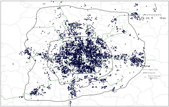 It can be seen from Figure 1 that the market-based rental housing is relatively concentrated in the main urban area, and the periphery is extended along the subway line. The supply and demand of market-based rental housing reflect a complete market behavior [5,17]. The hypothesis of marketers, for the pricing model of market-based rental housing, allows us to apply a characteristic price model and a fixed rent factor.