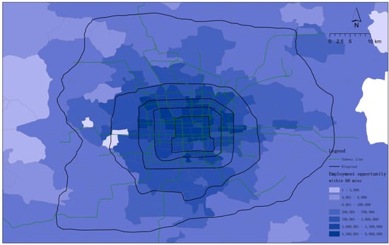 The employment opportunity data comes from the Beijing Employment Accessibility Map [33], which depicts the total number of employment opportunities that people who use the city’s public transportation system can achieve in 30, 45, and 60 min travel times across streets, towns, and villages in Beijing’s metropolitan area.