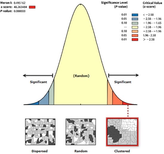 This article first calculates the global Moran’s I index to measure the degree of spatial autocorrelation of the benchmark rent of the sample rental housing community. Using Matlab software, the Moran’s I coefficient of is calculated to be 0.4952, and the p value is 0.0000, which has passed the significant value at the 1% level. The test, and the Z score, is 48.26, which is significantly positive, indicating that the benchmark rent has spatial effects and positive spatial autocorrelation (Figure 3).