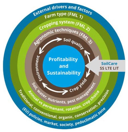The basic concept adopted in the SoilCare project was that profitability and sustainability of crop production in Europe should be integrated and enhanced. Both are influenced by choices made in farm management, which are in turn influenced by external drivers and factors (Figure 1). External drivers and factors include E.U. policies and international agreements, supply chain and market effects (suppliers, industry, processing, retail, and consumers), macroeconomic conditions, society (public opinion), and pedoclimatic conditions. These external drivers and factors are dynamic and change because of socioeconomic developments, geopolitics, and climate change. As the focus of SoilCare was on arable cropping systems, grazing systems, multisystem farms, and other on-farm activities were not considered.