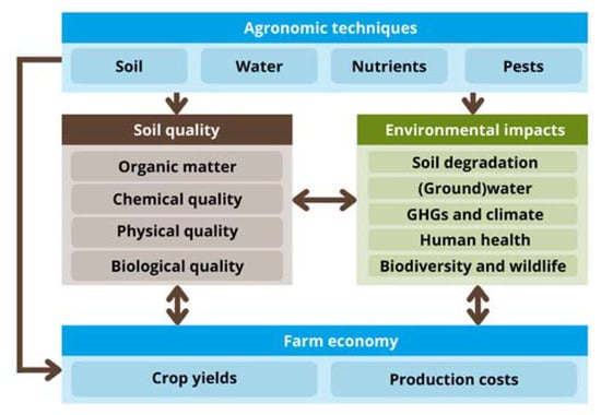 Choices made at all three FMLs have impacts on soil quality, on the environment, and on yield (thus farm economy) (Figure 1). These also influence each other. For example, the occurrence of a soil threat such as erosion influences soil quality as well as crop yield []. Crop yield can also influence soil quality, for example, through nutrient mining, rooting effects, and below-ground biomass. When impacts on soil quality and environment are positive, and the balance between production costs and revenues is also positive, the dual targets of farm profitability and environmental sustainability are reached.