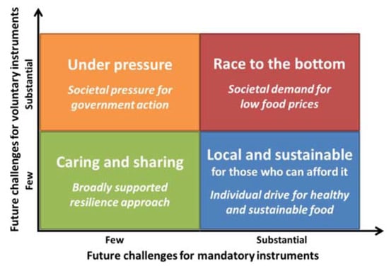 Finally, the study site results were upscaled to the European level using a storyline, simulation, and policy support process [,,]. This process combined participation and modelling to better understand the impacts of SICS across Europe and to provide policy support to facilitate the uptake of SICS under different contexts and conditions. As part of the approach, an integrated assessment model (IAM) consisting of spatial, socioeconomic, and environmental simulation models (i.e., the AGMEMOD [], METRONAMICA [], PESERA [], dyna-QUEFTS [], and MITERRA [] models) was developed []. The IAM was used to simulate possible effects of four scenarios that captured diverse pathways for European agriculture until 2050 (Figure 4). These scenarios differed with regard to challenges to voluntary instruments and mandatory instruments. We used a combination of qualitative and quantitative techniques in a multi-actor approach to develop these scenarios in order to assess how agricultural practices could contribute to sustainable and profitable European agriculture and, finally, to discuss what is needed to enable adoption and implementation of these practices. In addition, for a range of 27 SICS, Europe-wide maps and modelling were combined with expert judgement from study site partners and their stakeholders to provide a SICS potential index based on the applicability, relevance, and impact of each SICS []. An interactive web-based tool was developed to help land users and decision makers select suitable SICS throughout Europe (imt.soilcare-project.eu; accessed on 13 April 2022) []. This tool allows users to compare different SICS with regard to various aspects, including IAM results and the SICS potential index.