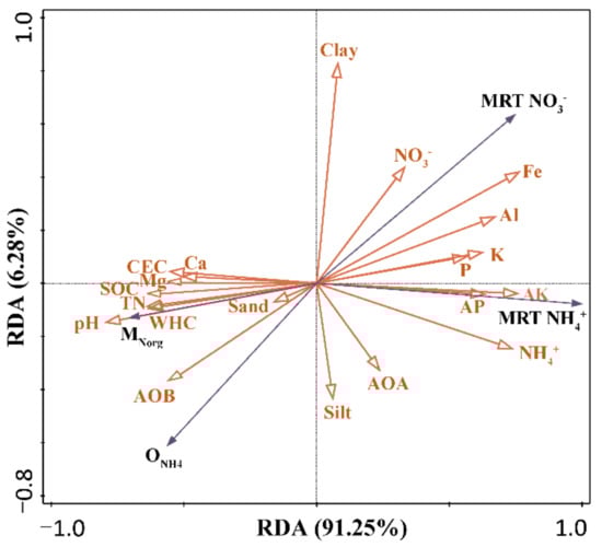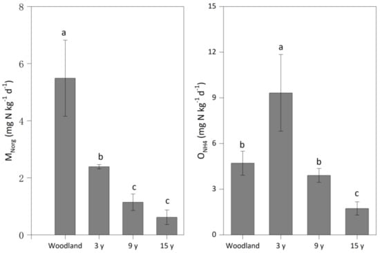 The mean residence times (d) of NH4+ (MRT NH4+) and NO3− (MRT NO3−) were calculated using the equation developed by Corre et al. [], which can indicate the turnover of inorganic N.