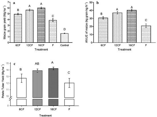 Figure 2. (a) Maize grain yield (MGY, dry weight), (b) agronomic nitrogen use efficiency (ANUE) of maize, and (c) potato tuber yield (PTY, fresh weight) in the different treatments of the study, 6CF = 5.7 Mg ha−1 compost on fresh weight (FW) basis and 72.8 kg N ha−1 mineral fertilizer; 12CF = 12 Mg ha−1 compost (FW) and 39.4 kg N ha−1 mineral fertilizer; 16CF = 16 Mg ha−1 compost (FW) and 19.5 kg N ha−1 mineral fertilizer; F = 108.3 kg N ha−1 mineral fertilizer only; Control = no input. Different letters above columns indicate significant differences between treatments (p < 0.05).