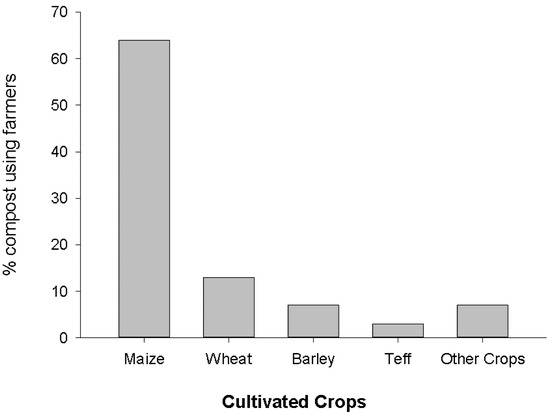 Approximately 62% of the respondents indicated that decreasing soil fertility and yields were the main reasons for the adoption of compost application. Farmers commonly stated that the traditional practice of fallow, which allows the accumulation of organic matter and nutrients, was not sufficient to produce the required yields. Approximately 26% of the respondents indicated that they were motivated by other farmers who were already producing and applying compost. Approximately 12% of the respondents indicated that the high cost and inaccessibility of mineral fertilizers were their main reasons for the adoption of compost application. Few farmers (8%) stated that they had access to credit to purchase mineral fertilizers, but most of the time, they were not able to pay back their loans. In general, farmers tended to apply their compost to fields where they grew crops with high nutrient requirements, mostly maize, but also wheat (Triticum aestivum L.), barley (Hordeum vulgare L.), teff (Eragrostis tef (Zucc.) Trotter), and other crops (Figure 3). Moreover, economic returns were taken into consideration when farmers applied compost. Some farmers (7%) supplemented cereal production with vegetables, for which they could achieve higher revenues on the market (Figure 3).