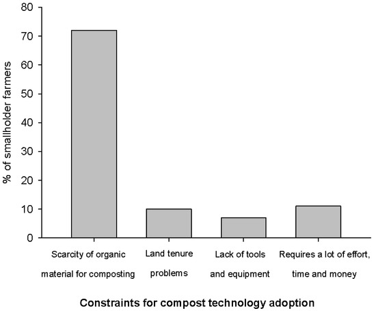 The lack of organic waste was mentioned by the vast majority of farmers as a major constraint for producing and applying compost (Figure 4). In contrast, the required time, labor, and investment, as well as land tenure and lack of tools and equipment, played a subordinate role in hindering them from adopting composting and compost applications (Figure 4).