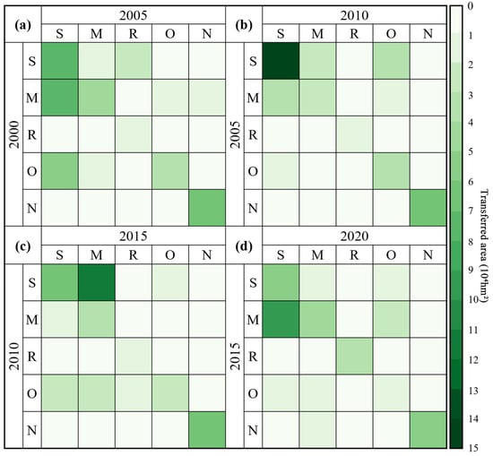 Transition matrix of crops 2000–2005, 2005–2010, 2010–2015 and 2015–2020 (a–d) (S for soybean; M for maize; R for rice; O for other crops; N for non-cultivated land).