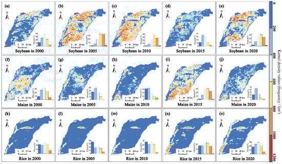 Kernel density of soybean (a–e); maize (f–j); rice (k–o) in 2000, 2005, 2010, 2015, and 2020.