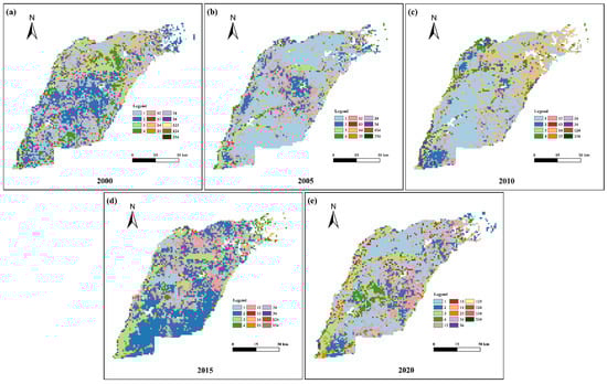 Spatial distribution of CPS based on 900 m × 900 m units in 2000, 2005, 2010, 2015, and 2020 (a–e) (1: single type of soybean; 2: single type of maize; 3: single type of rice; 4: single type of other crops; 12: mixed type of soybean–maize; 13: mixed type of soybean–rice; 14: mixed type of soybean–other crops; 23: mixed type of maize–rice; 24: mixed type of maize–other crops; 34: mixed type of rice–other crops; 123: mixed type of soybean–maize–rice; 124: mixed type of soybean–maize–other crops; 134: mixed type of soybean–rice–other crops; 234: mixed type of maize–rice–other crops).