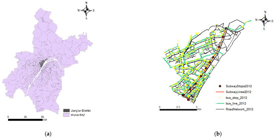 This study considers the Jiang’an District, City of Wuhan, China as the case study. The City of Wuhan is located at a latitude of 29°58′–31°22′ north and a longitude of 113°41′–115°05′ east. The City of Wuhan has 13 districts under its jurisdiction. As of the end of 2019, the total area of Wuhan was 8569.15 , with a resident population of 11.212 million. In recent years, rail rapid-transit development in Wuhan has accelerated. The length of completed rail-transport lines expanded considerably from 2011 to 2015, from 28.68 km to 125.64 km [60]. In addition, only line 1 is within the study region; line 1, which was constructed in 2004 and then extended in 2010 and 2014, was the only elevated rail line. It follows a path parallel to the Yangtze and Han rivers [60]. The City of Wuhan has around 4.77 million employees, working in various sectors in 2012, and it had increased to 5.06 million by 2015.