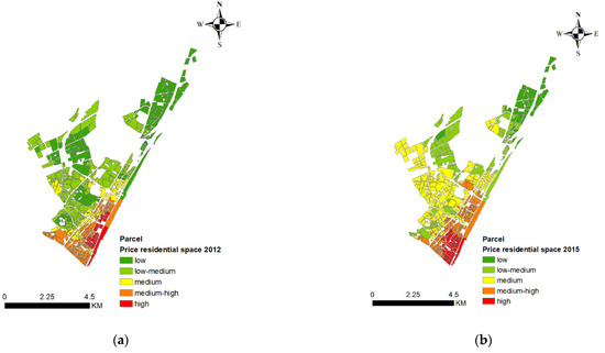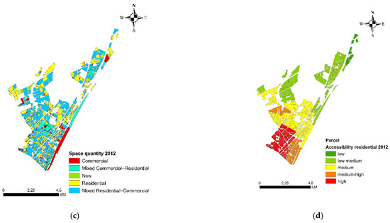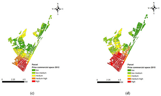 (a–d) Floor-space prices for residential and commercial for years 2012 and 2015 at parcel level; (a) average price for residential space (2012); (b) average price for residential space (2015); (c) average price for commercial space (2012); and (d) average price for commercial space (2015).