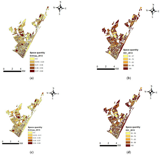 (a–d). An entropy index and HH index for the years 2012 and 2015: (a) entropy index 2012; (b) HH index 2012; (c) entropy index 2015; and (d) HH index 2015.
