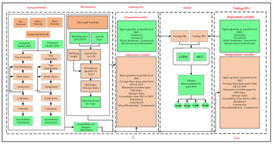 The transport model was developed and then used to calculate utility-based accessibility measures at the parcel level from 2012 to 2015. This model was developed using a multimodal network approach to represent the interactions between all transportation modes. As mentioned in the data Section 3.1, various datasets were adopted and several steps were taken, which enabled the calculation of accessibility measures for the residential, commercial, mixed residential–commercial, and mixed commercial–residential land-uses at the parcel level. These accessibility measures were used as the input to the MLP and LSTM models as independent variables. The model processes are as follows: