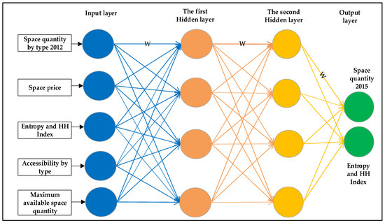 To evaluate the effect of transportation supply on mixed land-use change, the input layer contains neurons corresponding to the input value of each neuron (features) . The input layer considers 13 input values: space quantity 2012, average space price, maximum available space quantity, HH index, entropy index, different accessibility measures (residential, commercial, mixed residential–commercial), etc. The neurons in the output layer predict space quantity for 2015 for all parcels and the ratio of quantities of different types of land-uses by the HH index or entropy index. The weighted linear combination of the input variables is the output of the hidden neuron. In an MLP with one hidden layer, the sigmoid activation function is utilized to activate the mth hidden neuron.