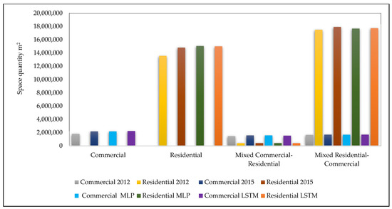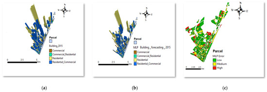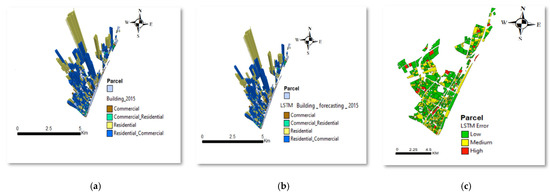 Figure 13a shows the observed floor space and Figure 13b depicts the MLP-estimated floor space, while Figure 13c shows the MLP prediction errors. The value for the range of prediction errors indicates: low prediction errors (0.000~5.448), medium prediction errors (5.449~23.48), and high prediction errors (23.49~46.80). The findings reveal that the majority of parcels have low prediction errors across all space types (residential, commercial, and mixed-space types), whereas those showing a high error are usually large parcels with a low space quantity. Figure 14a depicts the observed floor space and Figure 14b shows the LSTM-estimated floor space, while Figure 14c shows the LSTM prediction errors. The value for the range of prediction errors indicates: low prediction errors (0.000~2.513), medium prediction errors (2.514~7.211), and high prediction errors (7.212~17.34). The results indicate that most of the parcels show low prediction errors for all space types (residential, commercial, and mixed-space types). The difference between the actual building type in 2015 with the MLP model prediction and the LSTM model prediction indicate that the LSTM model is more accurate at forecasting than MLP.