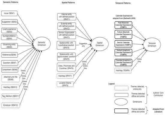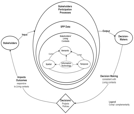 Based on our interpretation of these relationships, we note that the identification of spatial and temporal information in SPP data will be needed to help decision-makers complement their understanding about the living contexts. To fulfill this need, spatial and temporal dimensions should be identified and analyzed as complementary dimensions to the semantic dimension of the stakeholders’ living contexts. This way, spatial and temporal dimensions should help to locate in space and time, the semantic information (e.g., issues, suggestions, lived experiences) that stakeholders provide in SPPs (input).
