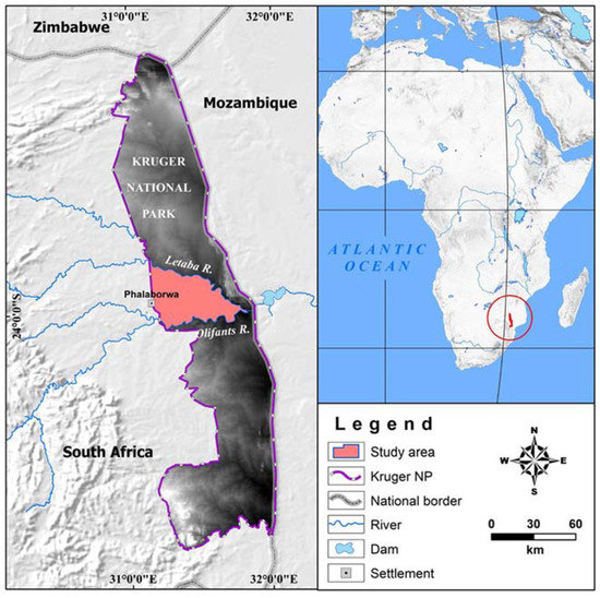 The research area of interest lies within the ‘Lowveld’ region of South Africa, between the eastern escarpment and the Lubombo mountains on the Mozambique border in the northeast. The site of this study is the Kruger Lowveld, located in the central part of the KNP, and corresponding to the geomorphological region defined as the Lowveld plateau, which is drained by the Letaba and Olifants rivers (Figure 1). The Kruger Lowveld study area is characterized by a relatively flat relief with an average altitude of 333.8 m, and a topographic structure oriented toward the southeast. The study area has high biodiversity and is hence internationally recognized as an important wildlife habitat conservation area [54].