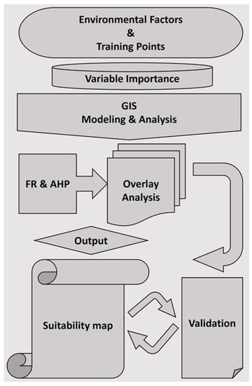 A hybrid approach based on GIS, FR, and AHP methods was used to determine the factors that affect the spatial distribution of termite mounds and hence termite habitat suitability in the Lowveld study area within KNP. The relationship between the training data and environmental factors was analyzed using the FR method, and the reciprocal relationship between the spatial factors was analyzed using the AHP method. This hybrid method was employed because FR is more effective in determining the in-class weights of environmental factors, and AHP is more effective in determining the relative importance of individual classes [66]. Thus, the factors that were determined directly based on the sample data were compared within the framework of a statistical consistency ratio. Therefore, a more objective and applicable evaluation is plausible with such a hybrid method. In addition, various GIS techniques were used in the analysis and imaging phase of the study (Figure 3).