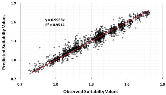 In the present study, training-point data were obtained through the mound-survey sampling method [46] applied in accordance with remote-sensing techniques. Training-data collection was performed with the help of high-resolution images from Google Earth between 2019 and 2021. Thus, spatial and spectral data of 8200 termite mounds were collected. The data were then subset into two groups: training and validation data for the model. Seventy percent of the data (5740 points) were used as training data and the remaining 30% (2460 points) were used as validation data to verify the predictive ability of the model. Spatial land-suitability analysis was performed for the termitaria by associating the training data with other spatial data obtained from multiple sources (Table 1). Suitability analysis was performed on 12.5 m-resolution DEM data. Topographic data such as aspect, slope, and altitude were produced from DEM data. Furthermore, the rest of the spatial data of the study area such as land-cover, soil, groundwater-depth, and climate data were obtained from various sources indicated in Table 1.