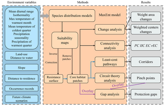 The framework for assessing changes in the BEP habitat suitability and connectivity, identifying pinch points, and gap analysis is shown in Figure 1.