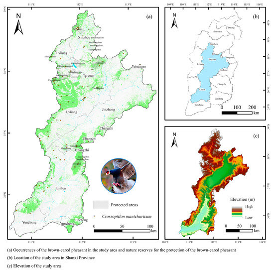 Brown-eared pheasant occurrence records were obtained from the global biodiversity information facility (GBIF, https://www.gbif.org/ accessed on 10 May 2022), eBird (https://ebird.org/ accessed on 10 May 2022), BirdReport (http://www.birdreport.cn/ accessed on 10 May 2022), and the available literature [7,12] see Supplementary Materials. Occurrences without clear coordinates were removed. Forests, conservation stations, villages, and towns included in each nature reserve of the BEP were found based on the geographical names database to find their central latitude and longitude [8]. In addition, we also compiled recent reports of BEP on the Internet and confirmed their specific coordinates through Google Earth (https://earth.google.com/ accessed on 10 May 2022). The BEP record reports were selected according to the following principles: (1) only data from exclusively within the research region were used; (2) duplicate points and other points within 300 m were removed to minimize model overfitting [13]; (3) points that fell outside the species’ height range were removed [14]; (4) only one point position was kept in a grid cell to avoid the effect of spatial autocorrelation as much as possible [15]; and (5) all points need to meet the physiological conditions of BEP to some extent. The global Moran I index was calculated to test whether the occurrence data are aggregated.