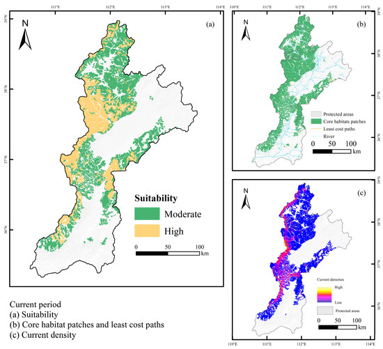 After removing the small patches, the weighted area of the existing suitable habitat was 86,810.10 in Figure 3a. Moderately suitable habitat accounted for 37.95% of the study area, whereas highly suitable habitat accounted for 34.92%.