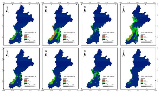 After removing the highly relevant environment variables, the 12 variables include mean diurnal range (bio2), isothermality (bio3), max temperature of warmest month (bio5), mean temperature of coldest quarter (bio11), precipitation seasonality (bio15), precipitation of warmest quarter (bio18), precipitation of coldest quarter (bio19), land-use, distance to water, slope, distance to road, and distance to residence. The Moran index of the occurrence point was calculated as follows: 0.176, z = 2.37, p = 0.007. The AUC values for all the SDMs were higher than 0.8 in all the climate scenarios, the Kappa was higher than 0.7, and the OR was less than 0.05, so the results were plausible in Table 1.