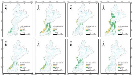 Under future climate scenarios, the weighted area of suitable habitats was much greater in the 2030s SSP245 and SSP585 than in the other scenarios. The weighted area of highly suitable habitat for the 2030s SSP126 and 2050s SSP585 scenarios, account for about 0.81% of the total weighted area. Under the four different 2030 climate scenarios, the weighted area of suitable habitats accounted for 22.32%, 63.16%, 25.97%, and 57.34%, respectively, of the basin in Figure 6. Under the four climate scenarios for the 2050s, the weighted area of suitable habitats accounted for 41.53%, 45.68%, 34.21%, and 12.93%, respectively, of the basin in Figure 6.