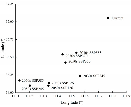 We assessed the spatial variation in habitats by calculating the weighted centroids of all the habitat patches and averaging them in Figure 7. The current latitude of the core habitat patches was 37.04° and the longitude was 111.77°. In all the future scenarios, there was a shift in the habitat from the present position to the south. The transfer distance ranged from a minimum of 57 km (2030s SSP585) to a maximum of 117 km (2050s SSP245). The latitude of the core habitat patches stabilized at 36.13° in the 2030s SSP126, 2050s SSP126, 2050s SSP245, and 2050s SSP585; 36.23° in the 2030s SSP245; 36.42° in the 2050s SSP370; and 36.55° in the 2030s SSP370 and SSP585. The longitude of the core habitat patches stabilized at 111.13° in the 2050s SSP585; 111.21° in the 2050s SSP245; 111.34° in the 2030s SSP126, 2050s SSP126; 111.45° in the 2030s SSP370, 2050s SSP370; and 111.54° in the 2030s SSP245 and SSP585.