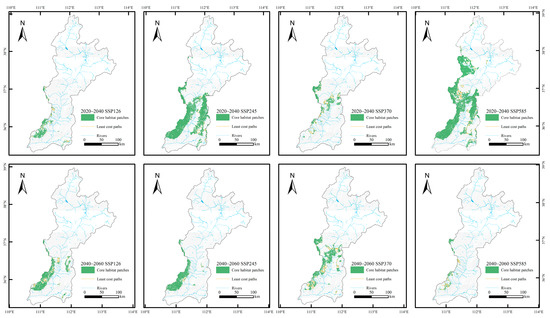 After excluding the least-cost pathways between completely adjacent habitat patches and least-cost paths that exceed the farthest dispersal distance, 57 corridors were identified in the current period, as shown in Figure 3b. These corridors are mainly located in areas where the habitat edges are heavily fragmented. Figure 8 shows the least-cost pathways between the core habitat patches for the different future climate scenarios. The largest number of corridors was identified in the 2030s SSP585 scenario, with 157 corridors. These corridors were mainly located in the northern, central, and southeast of the basin, connecting a large number of fragmented habitat patches. The minimum number of corridors identified in the 2050s SSP245 scenario was 45. These corridors were mainly distributed in the habitat patch fragmentation area southwest of the study area.
